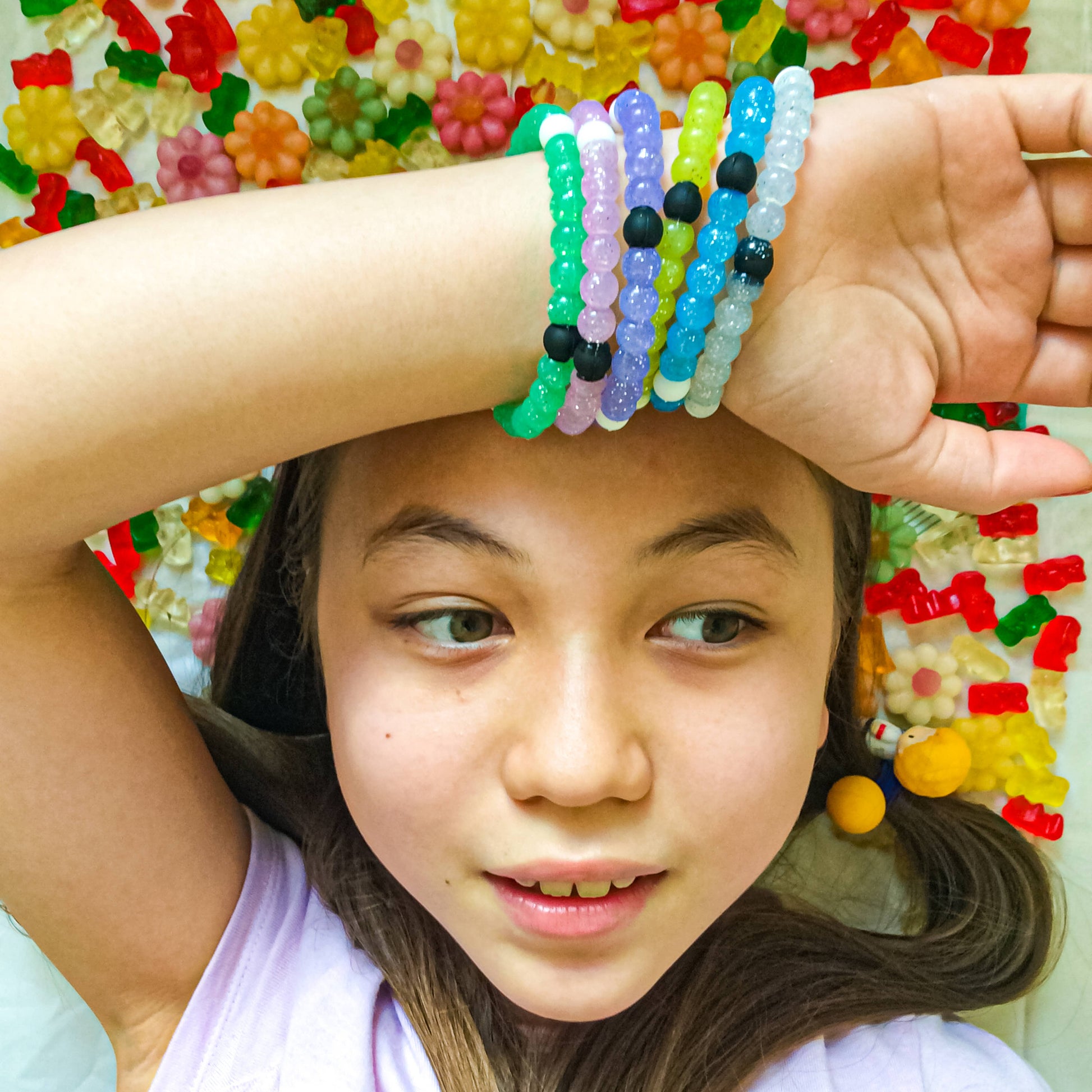 Colors - purple, yellow, blue, green, clear, pink * Made with stretch silicone * 2.5 inch diameter to best fit kids to teen girls Perfect for children's boutiques and gift shops.