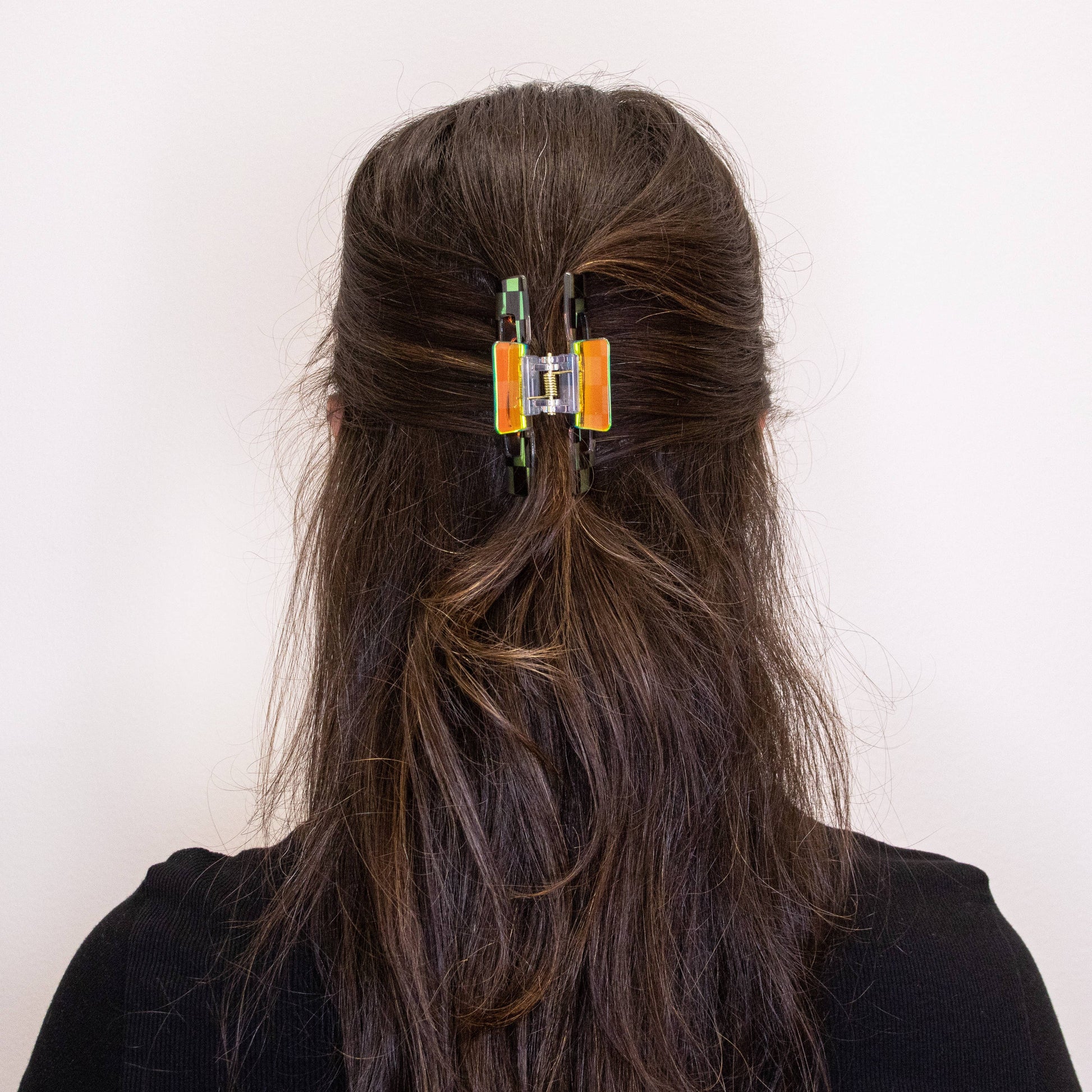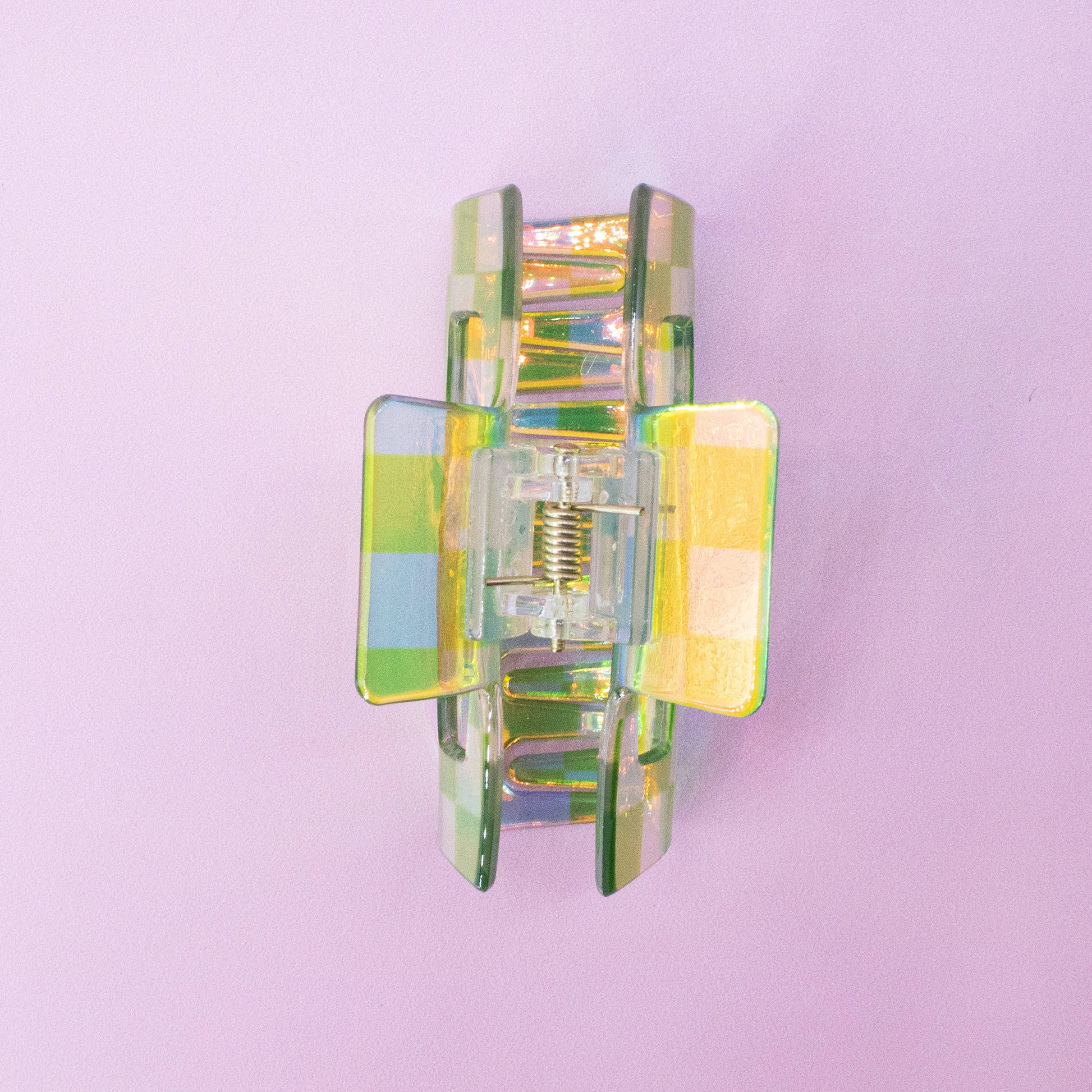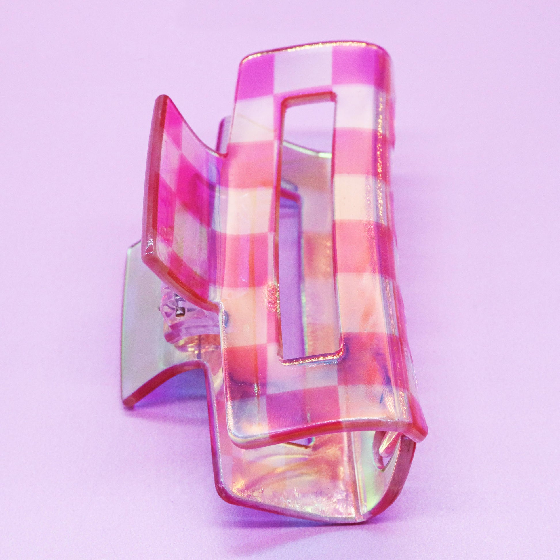Medium-sized square hair claw * Iridescent checkerboard design * Colors - black, pink, purple, or green * Length 3 inches * Width 1.75 inches * High durability * Stylish hair clip made of premium acrylic for a smooth glossy finish 90s and Y2K trends are IN right now! Our trendy hair claw clip styles are versatile for all hair types.