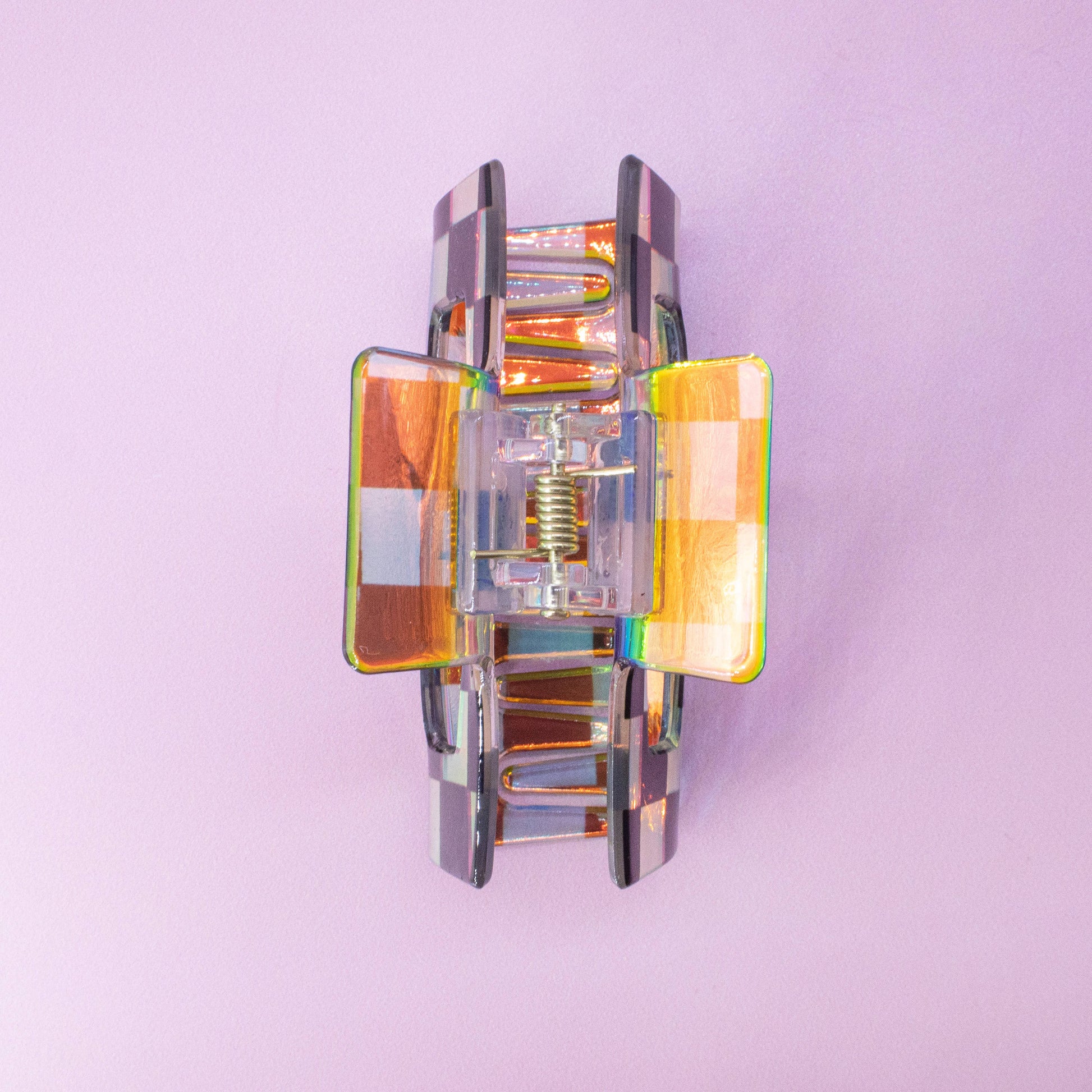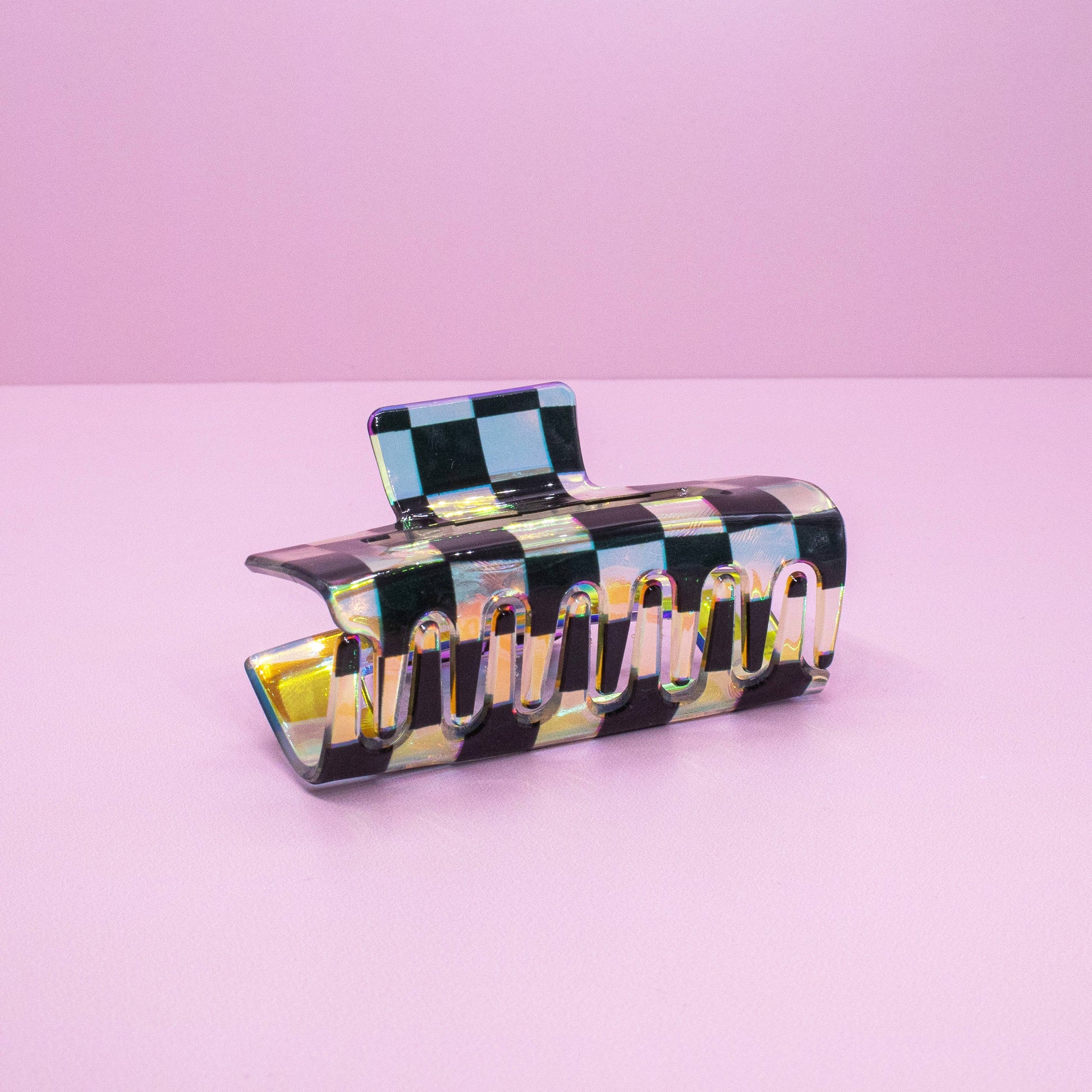 Medium Square Iridescent Checkered Hair Claw Clip: Black