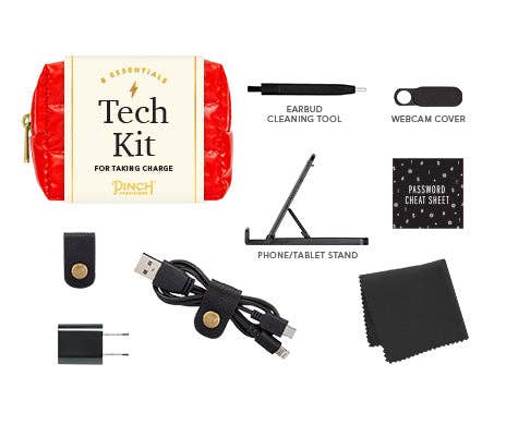Take charge with the Puffer Tech Kit by Pinch Provisions with 8 emergency essentials. Keep your favorite tech essentials together, and neatly organized, in sporty puffer pouch. Kit includes a webcam cover, earbud cleaning tool, screen cloth, password hint list, cord organizer, phone/tablet stand, 2-in-1 charging cable and USB wall charger. holiday gift, stocking stuffer, office, stationary, charging, iphone, android, apple, windows, computers, laptop accessories, puffer, corporate, pouch, zipper bag, tech accessories, tech products, tech organizer, trendy, novelty, gifting, technology, gadgets, winter trends