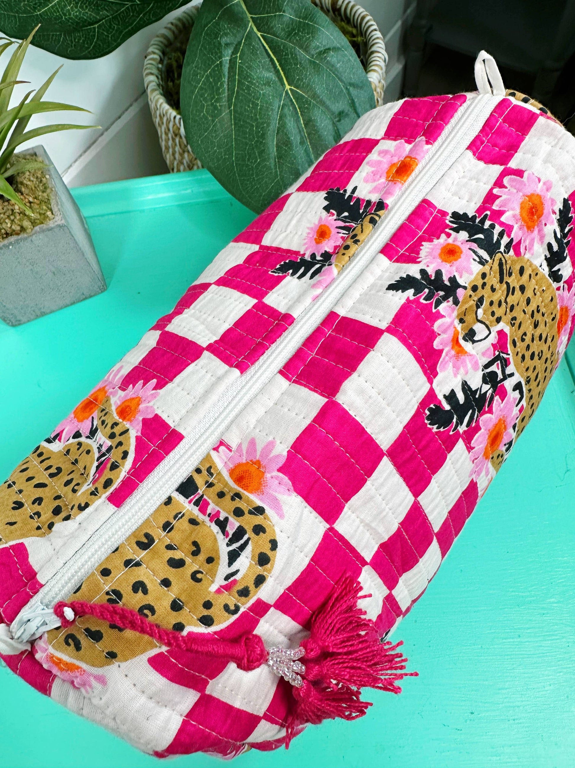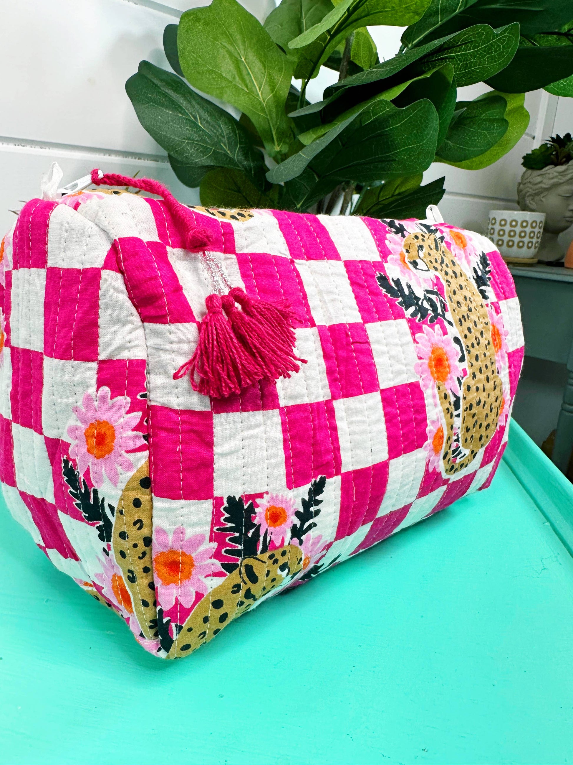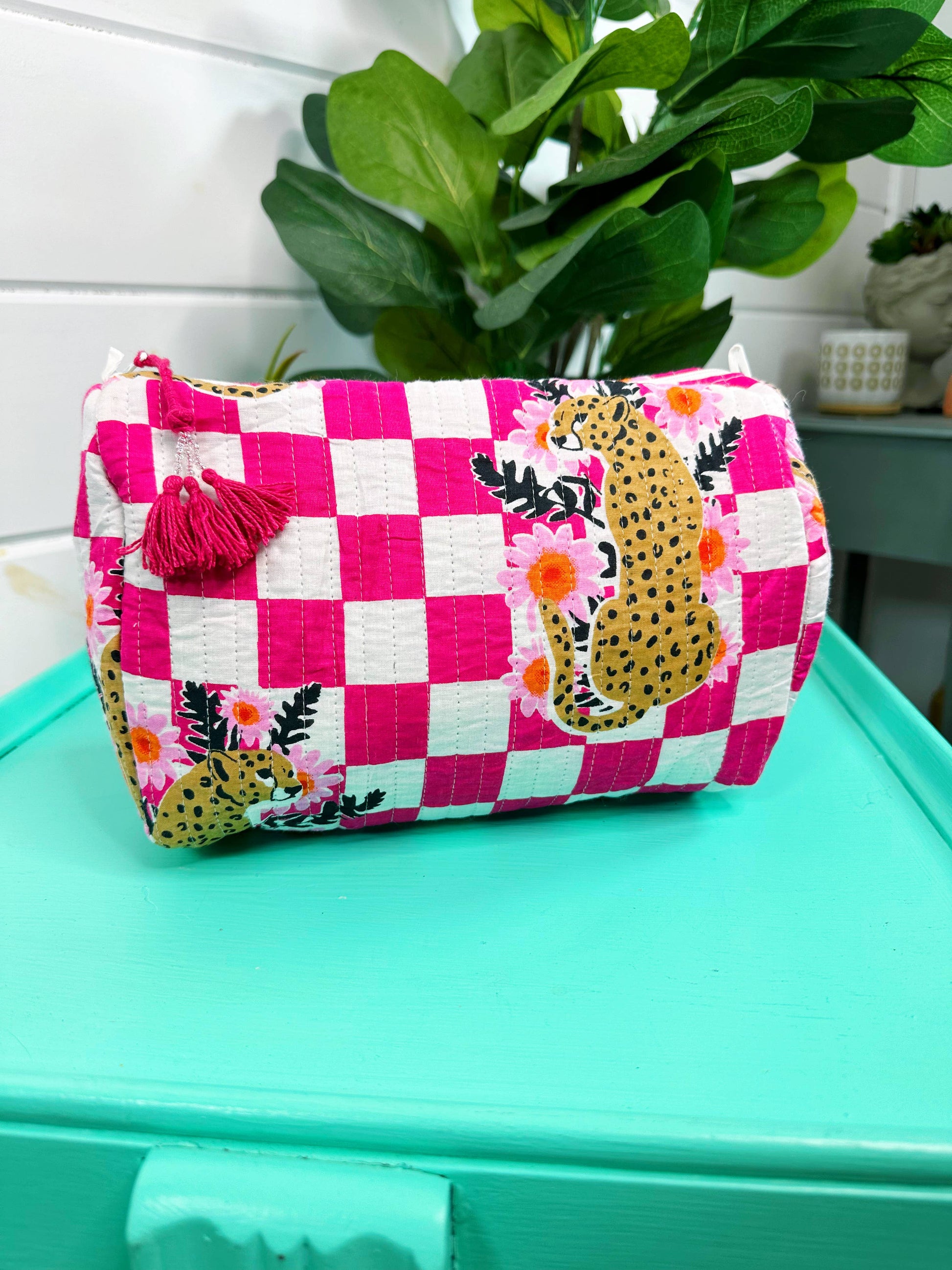 Pink Checkered Jaguar Print Quilted Cosmetics Bags: