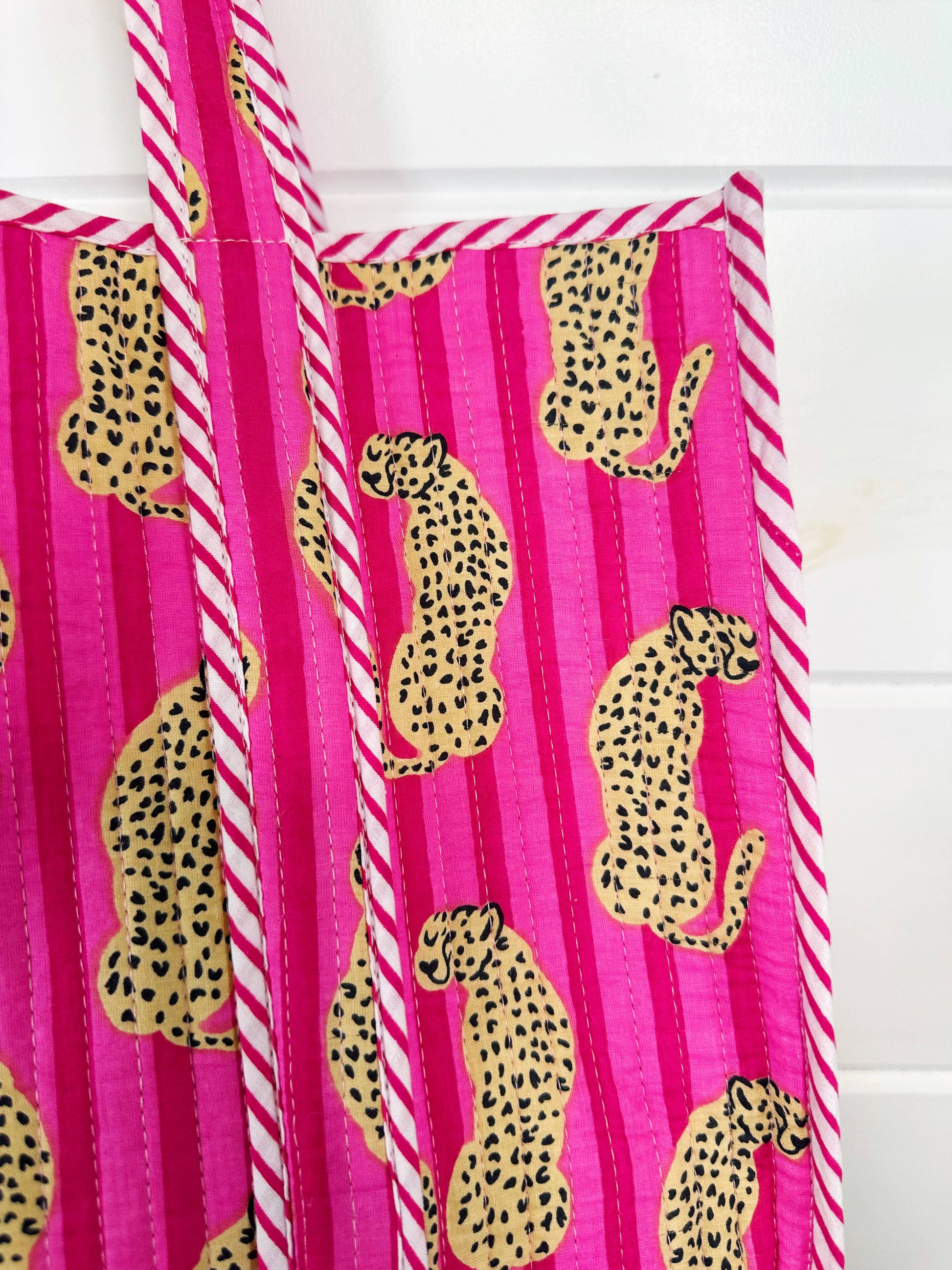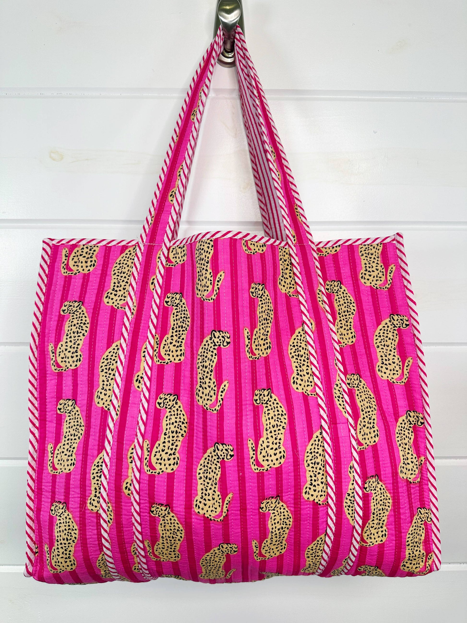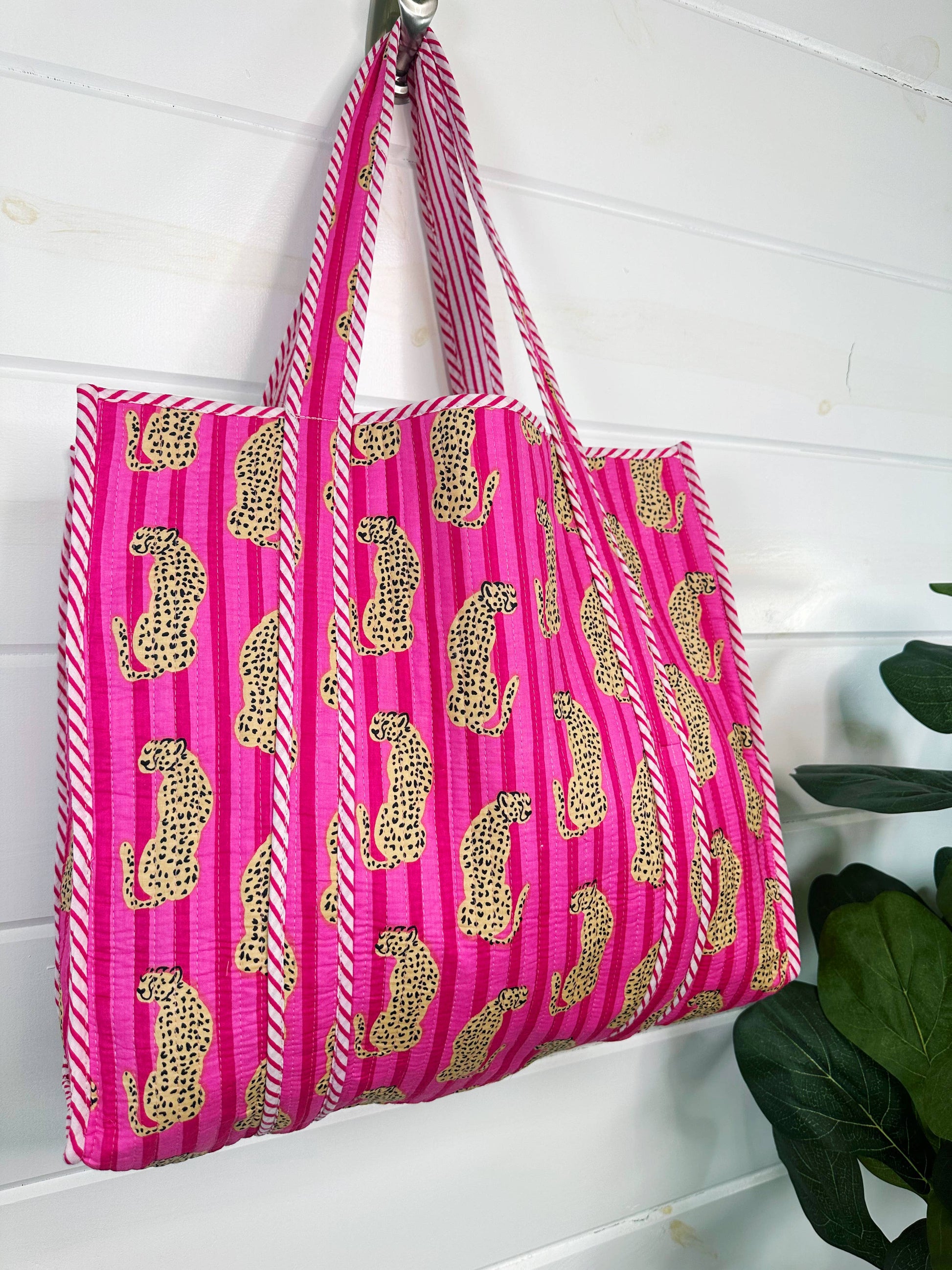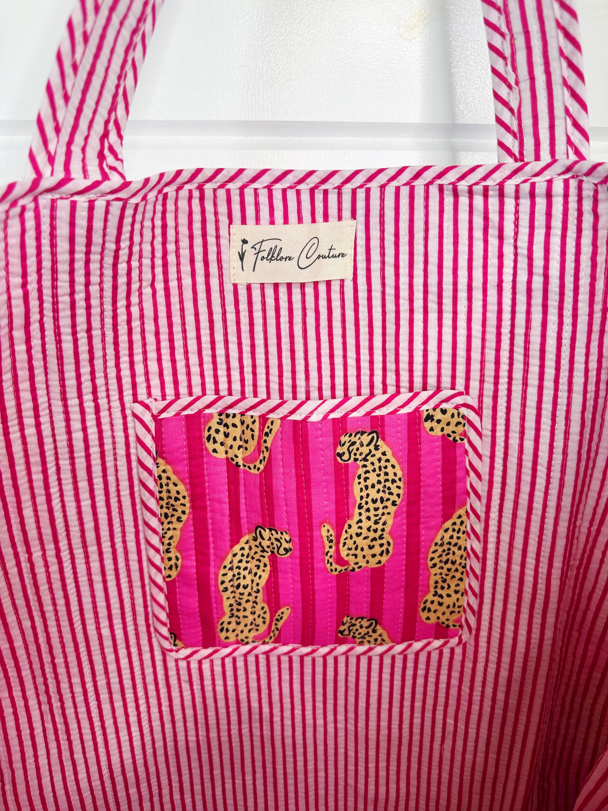 Pink Striped Jaguar Print Oversized Quilted Tote Bag: