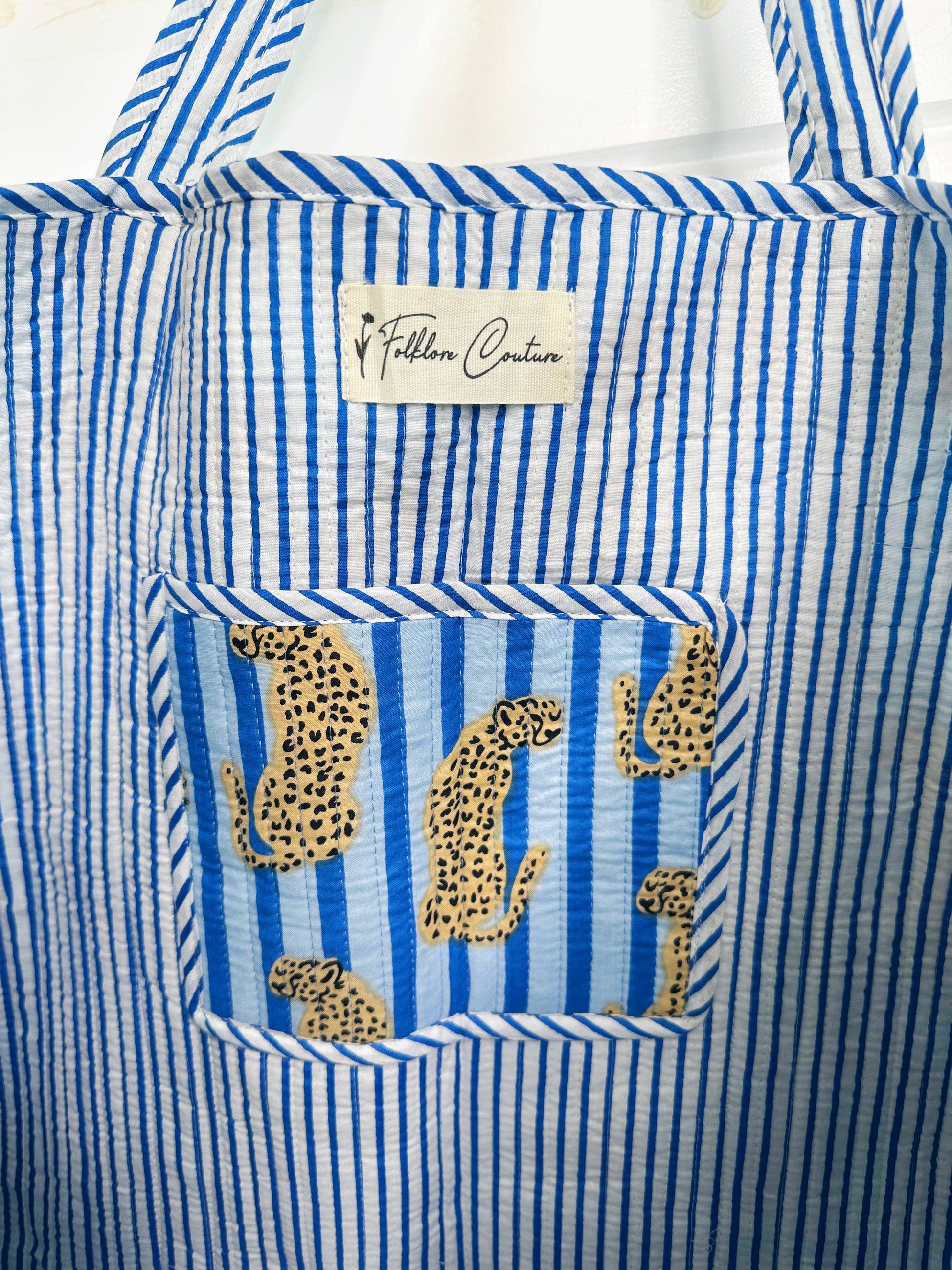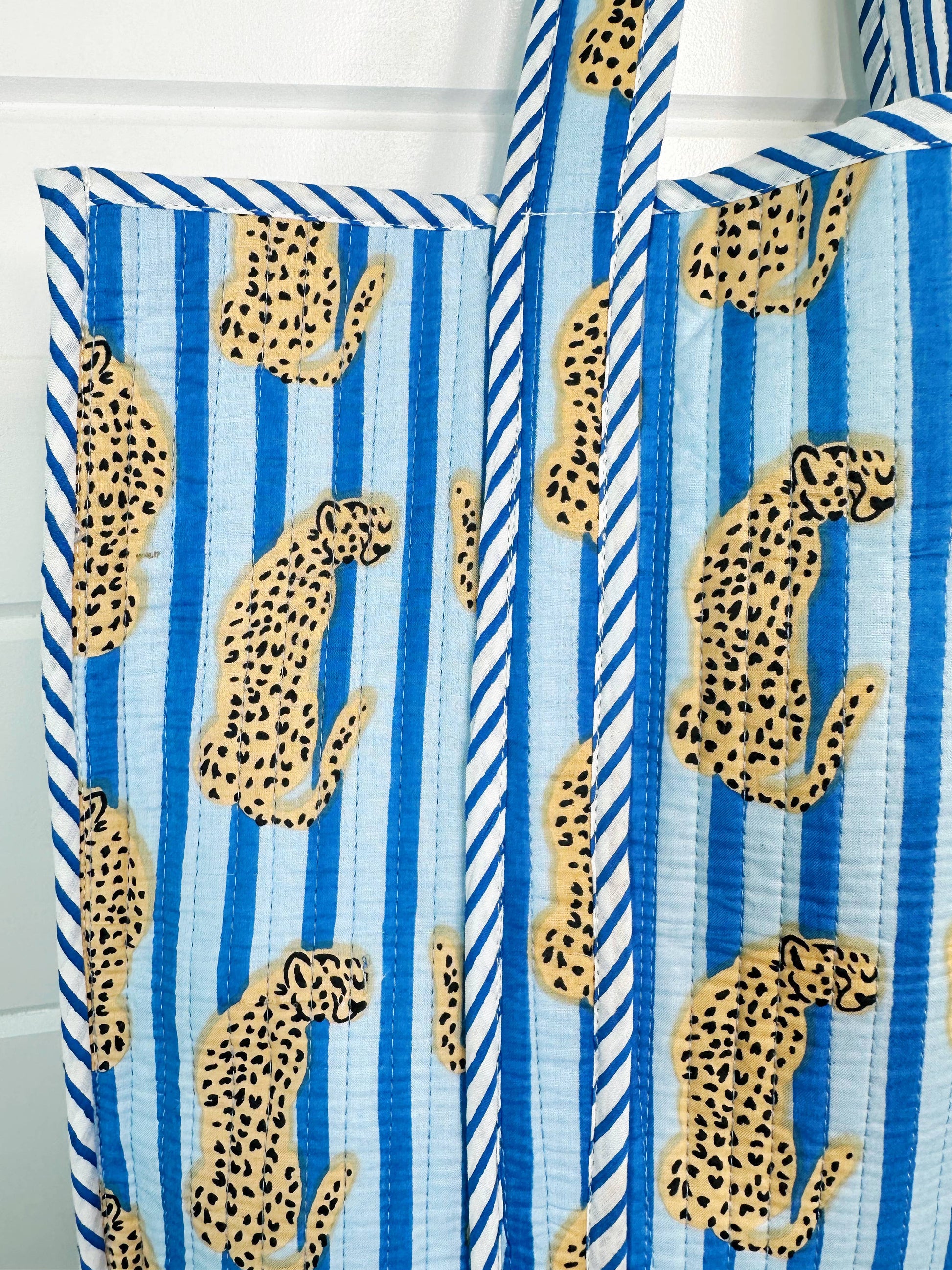 Blue Striped Jaguar Print Oversized Quilted Tote Bag: