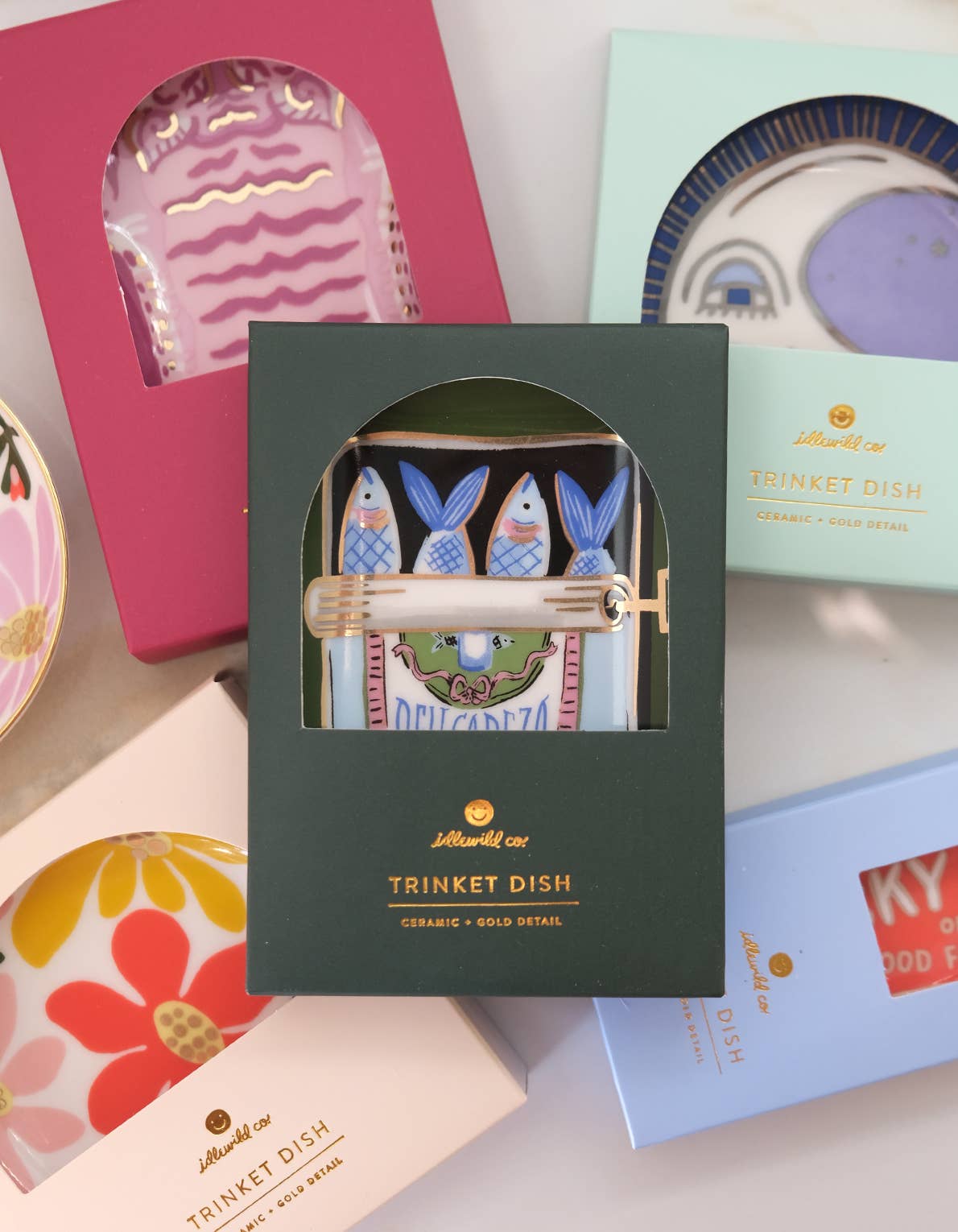 A fan favorite giftable–Our ceramic trinket dishes are the perfect catchall for your nightstand or dresser. White ceramic is adorned with our colorful, hand-painted designs, and we lined the edge in 10k gold for added flair. Perfectly packaged in plastic-free gift boxes, pretty enough to give without wrapping! • 3″ x 3″ Dish • Ceramic with 10k Gold Detailing • Plastic-Free Gift Box Keywords for SEO: Trinket Dish, Dish, Ring Dish, Ceramic, Porcelain, Gold, Idlewild Co., Idlewild, Accessory, Gift, Stocking Stuffer, Jewelry Dish, Jewelry Box, Sardines, Fish, Sea, Food, Portugal, home decor, vintage, display, earring display, displays for retail, gift idea, wedding, ceramics, engagement gift, jewelry displays, necklace display, ring dish, heart dish, heart trinket dish, trinket box, easter, food themed gift, food theme, foodie gift, travel