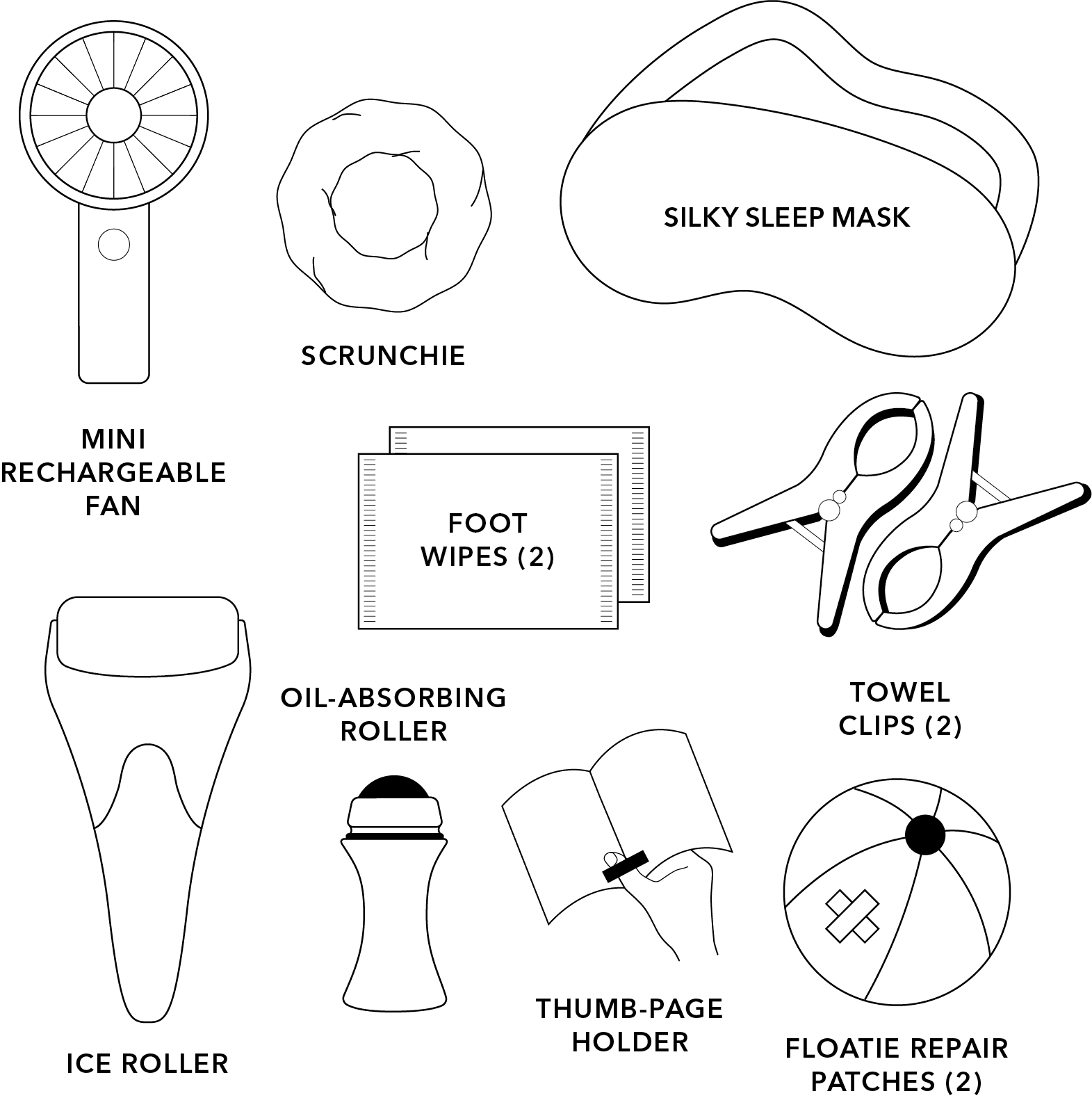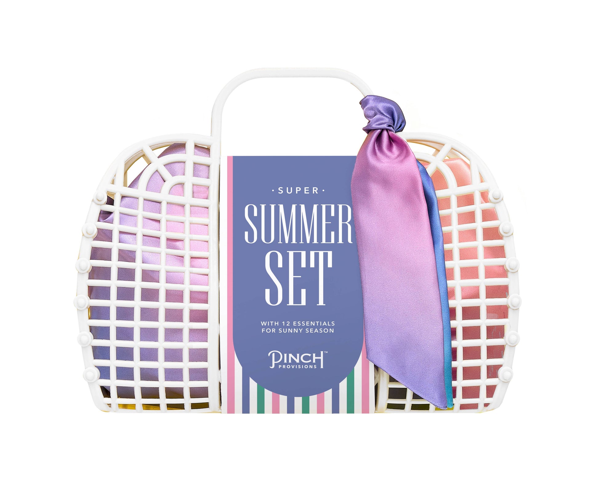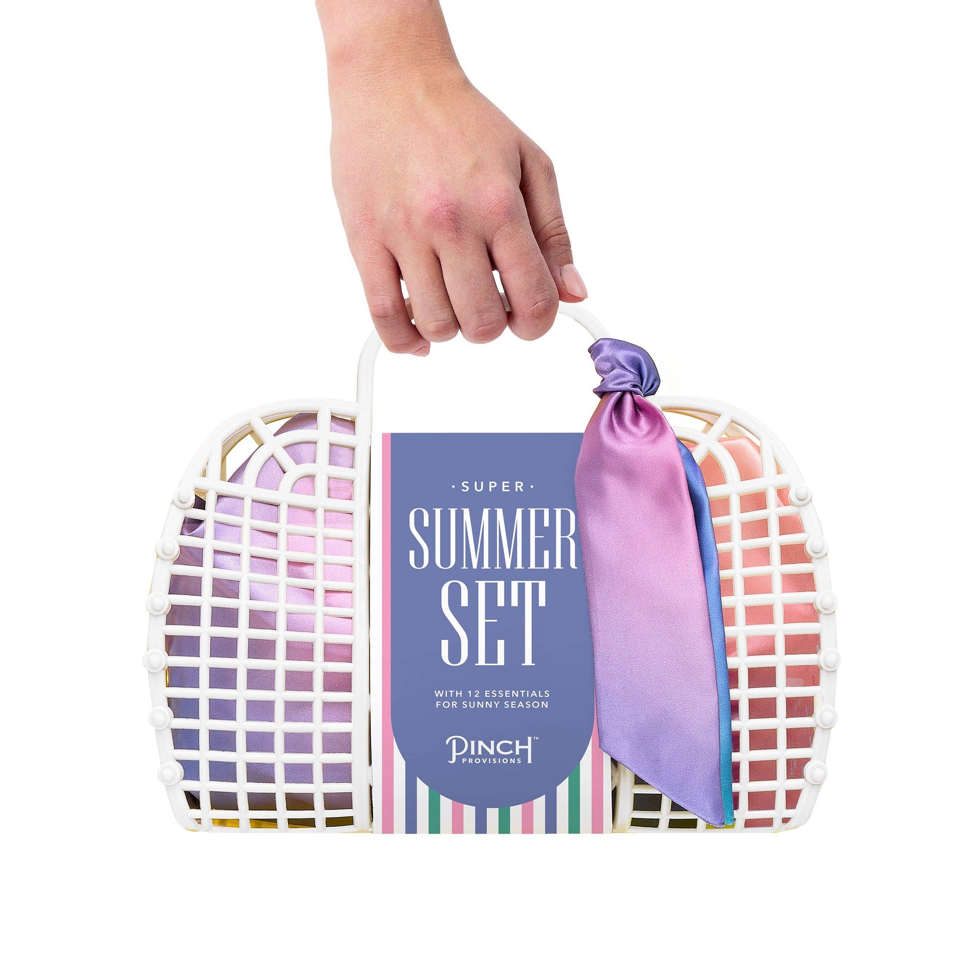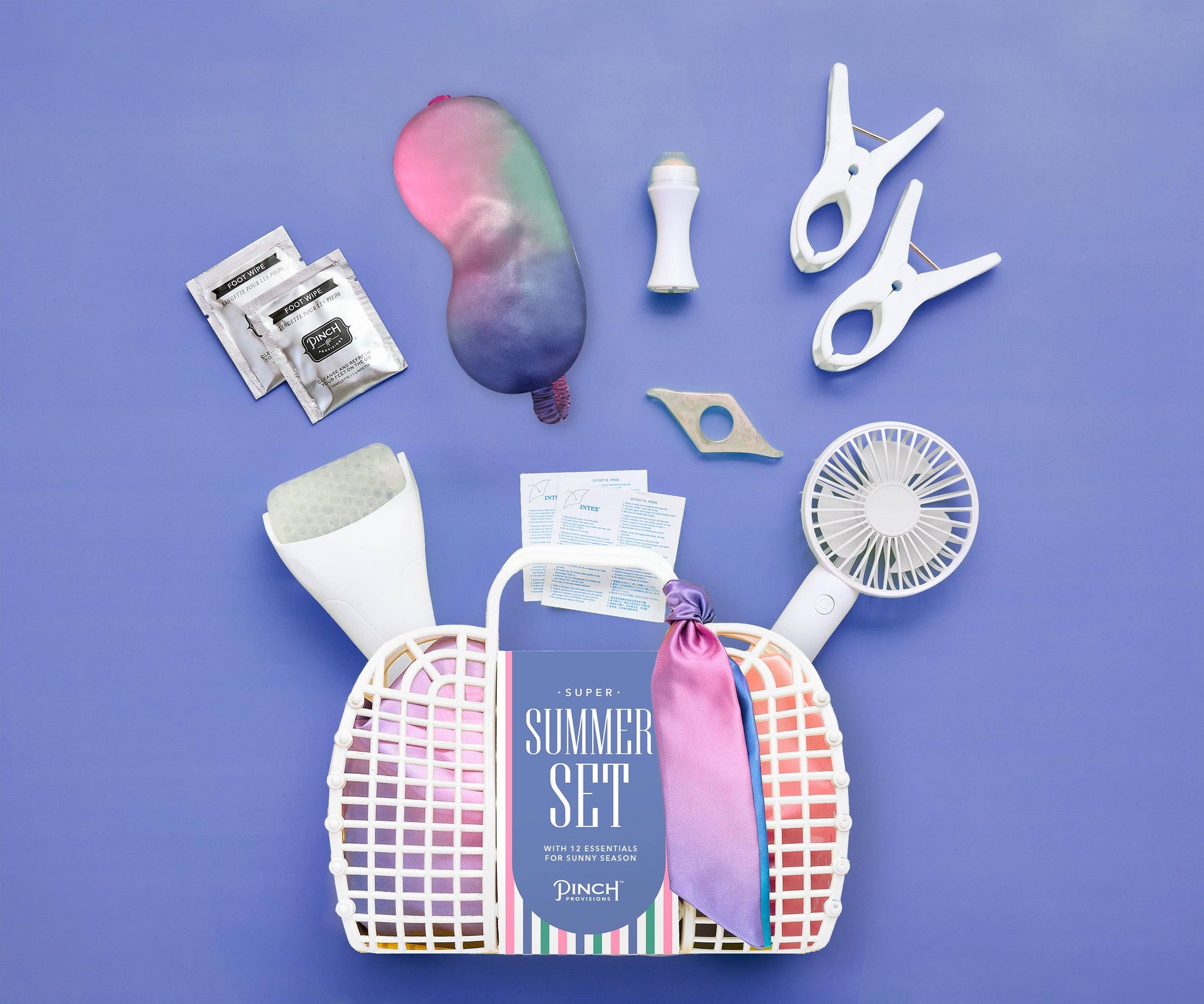 The Pinch Super Summer Set is not just super cute, it is super useful! The white jelly tote holds a dreamy, multicolor drawstring bag containing the perfect essentials for staying chill during the hot summer months. Each set contains 12 must-have essentials: a mini rechargeable fan, full-size ice roller, oil-absorbing roller, 2 towel clips, 2 foot cleansing towelettes, 2 floatie repair patches, a silky sleep mask, and a matching scrunchie.