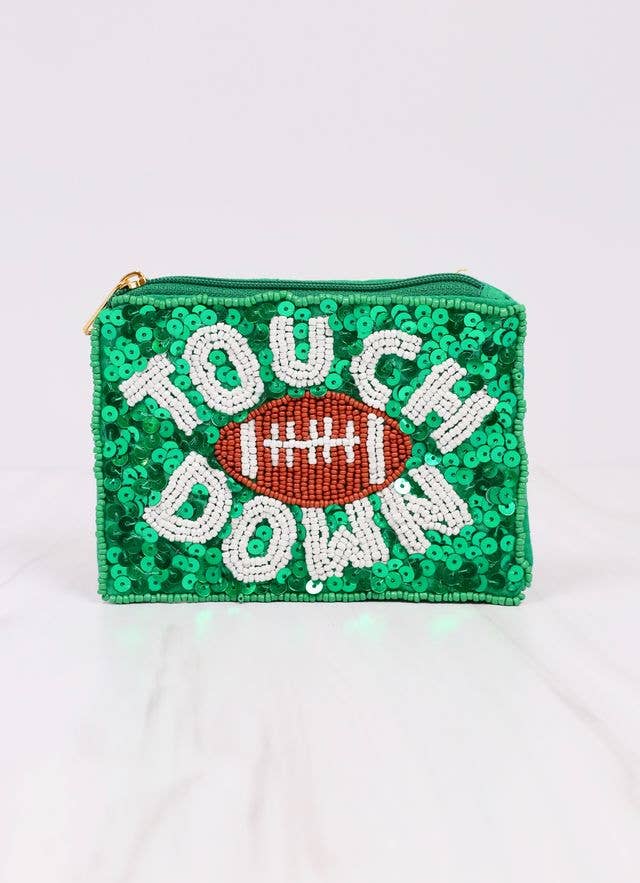 This sequin covered pouch features a beaded football with the word "Touchdown" on the front as well. It has a top zipper closure and a linen-feel back. Great to throw in your clear bag for a pop of color!